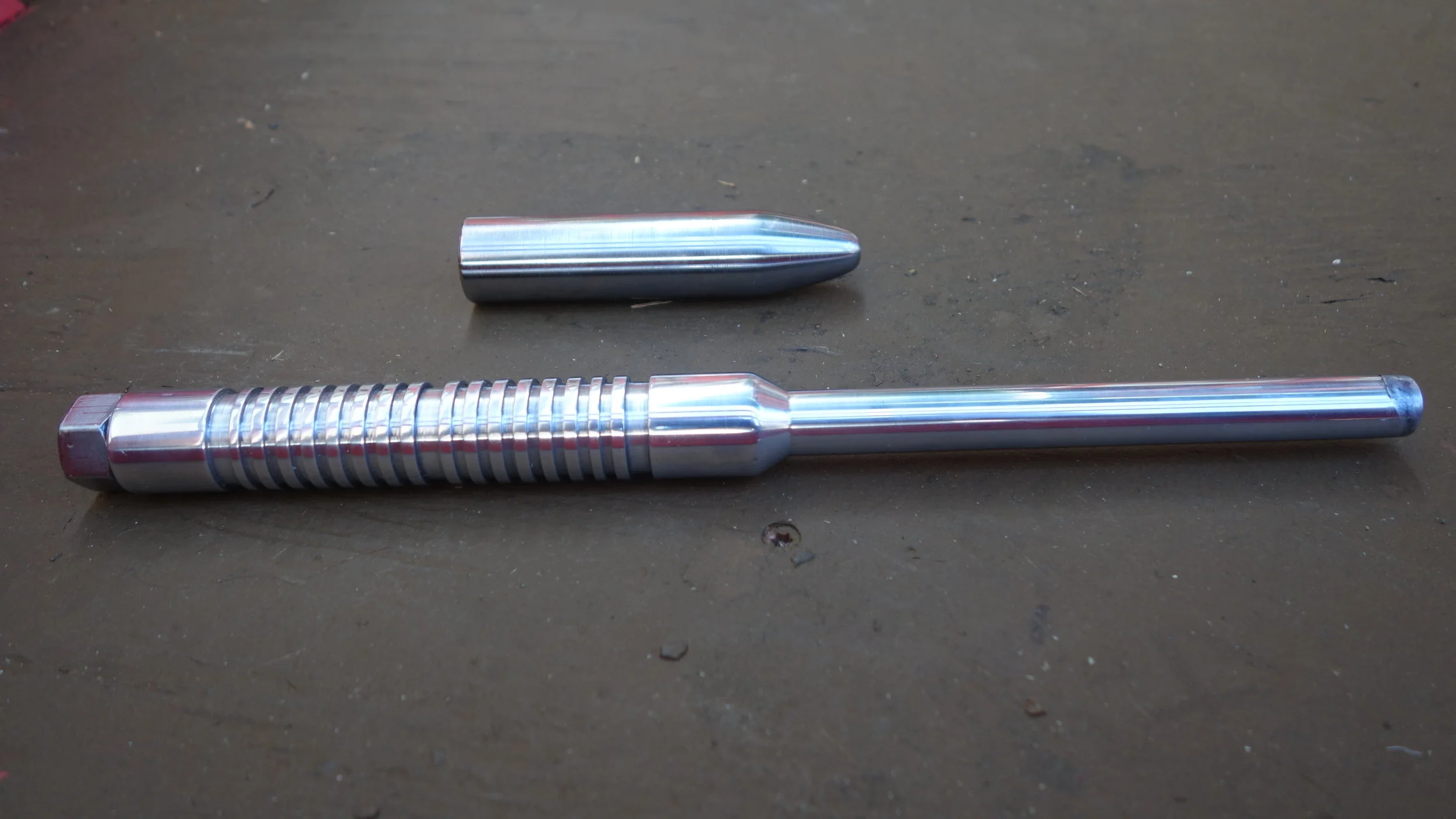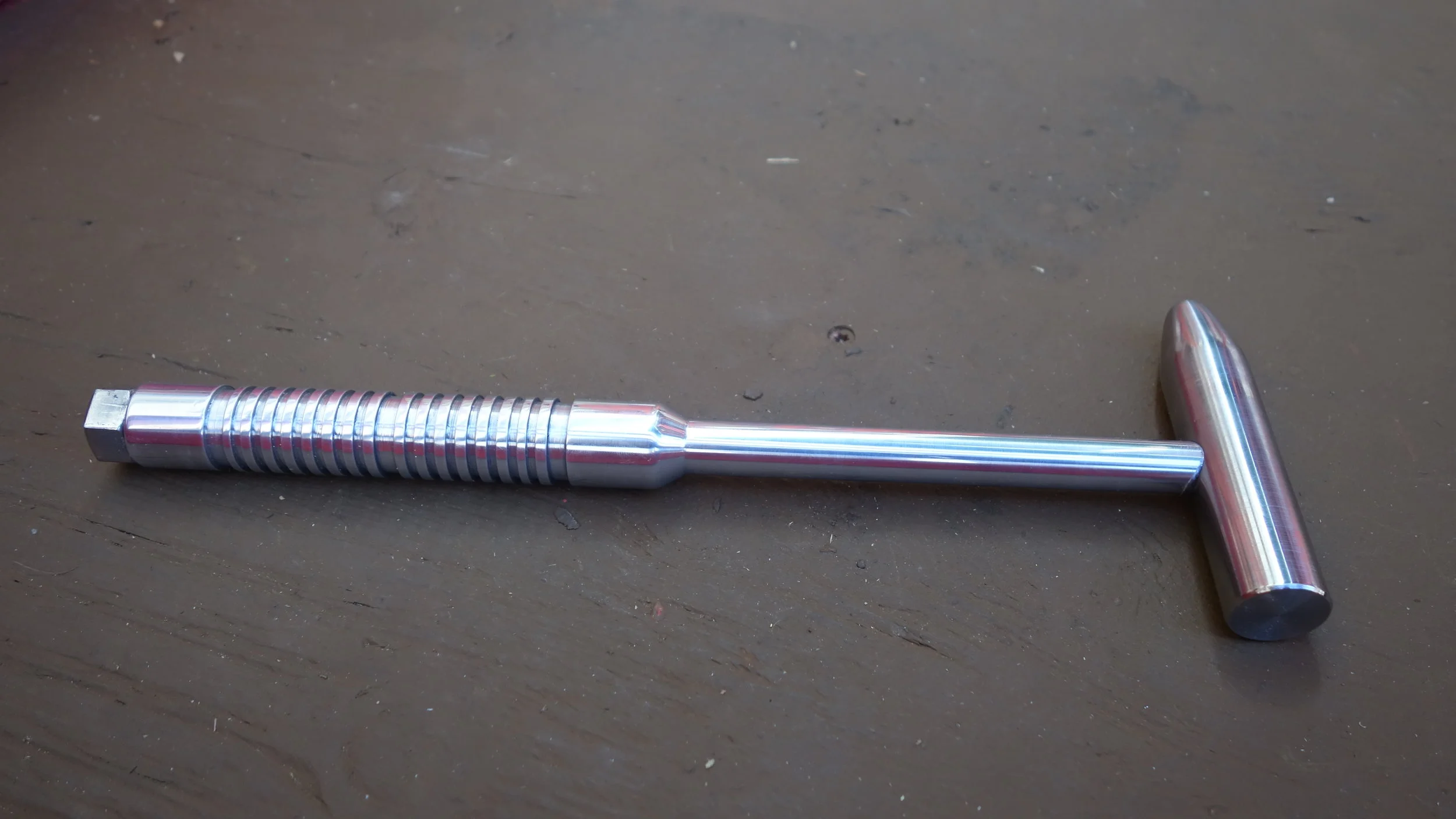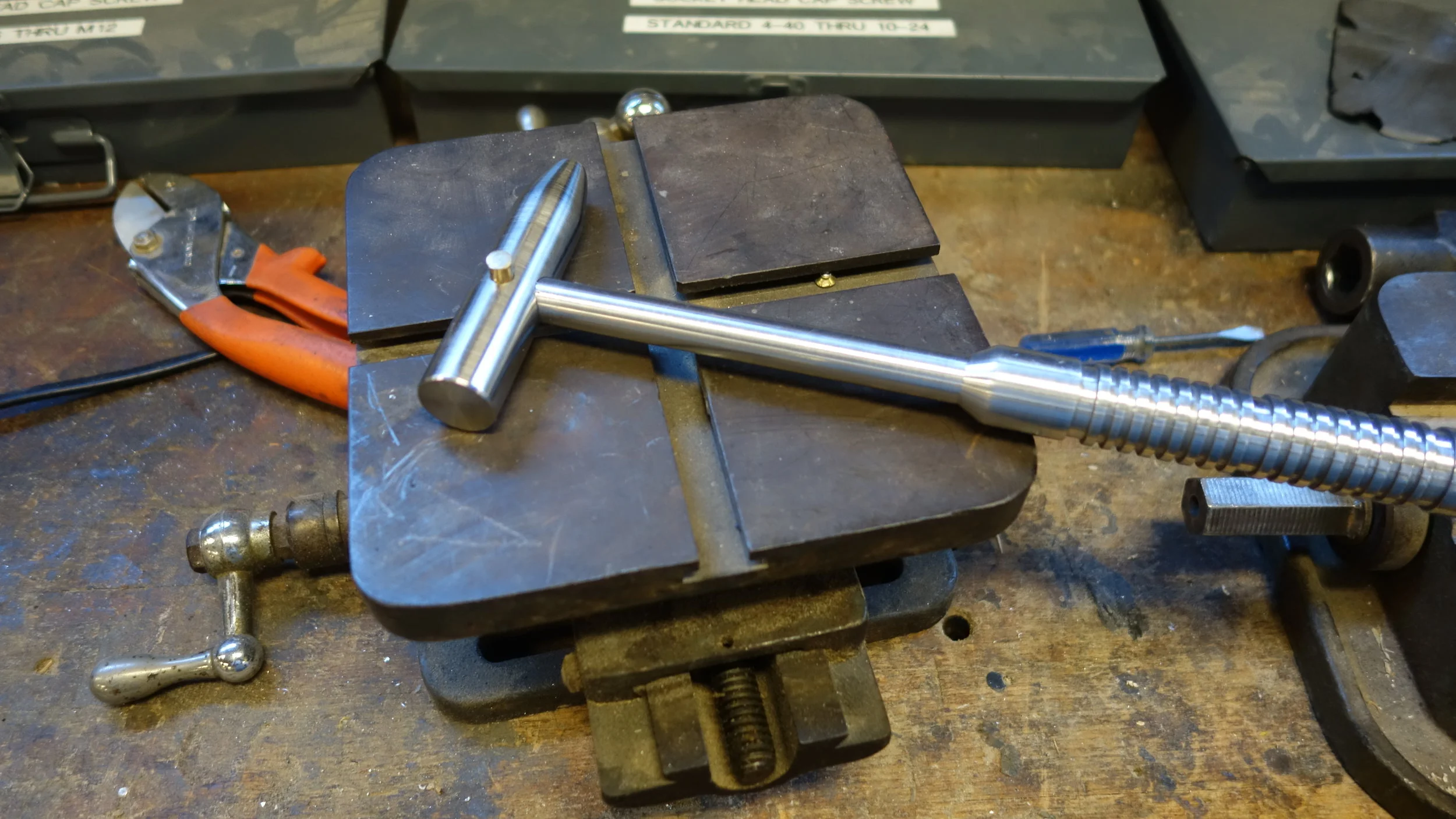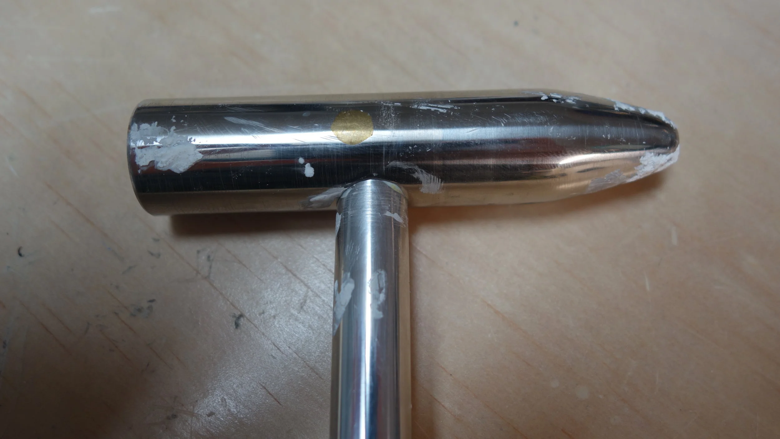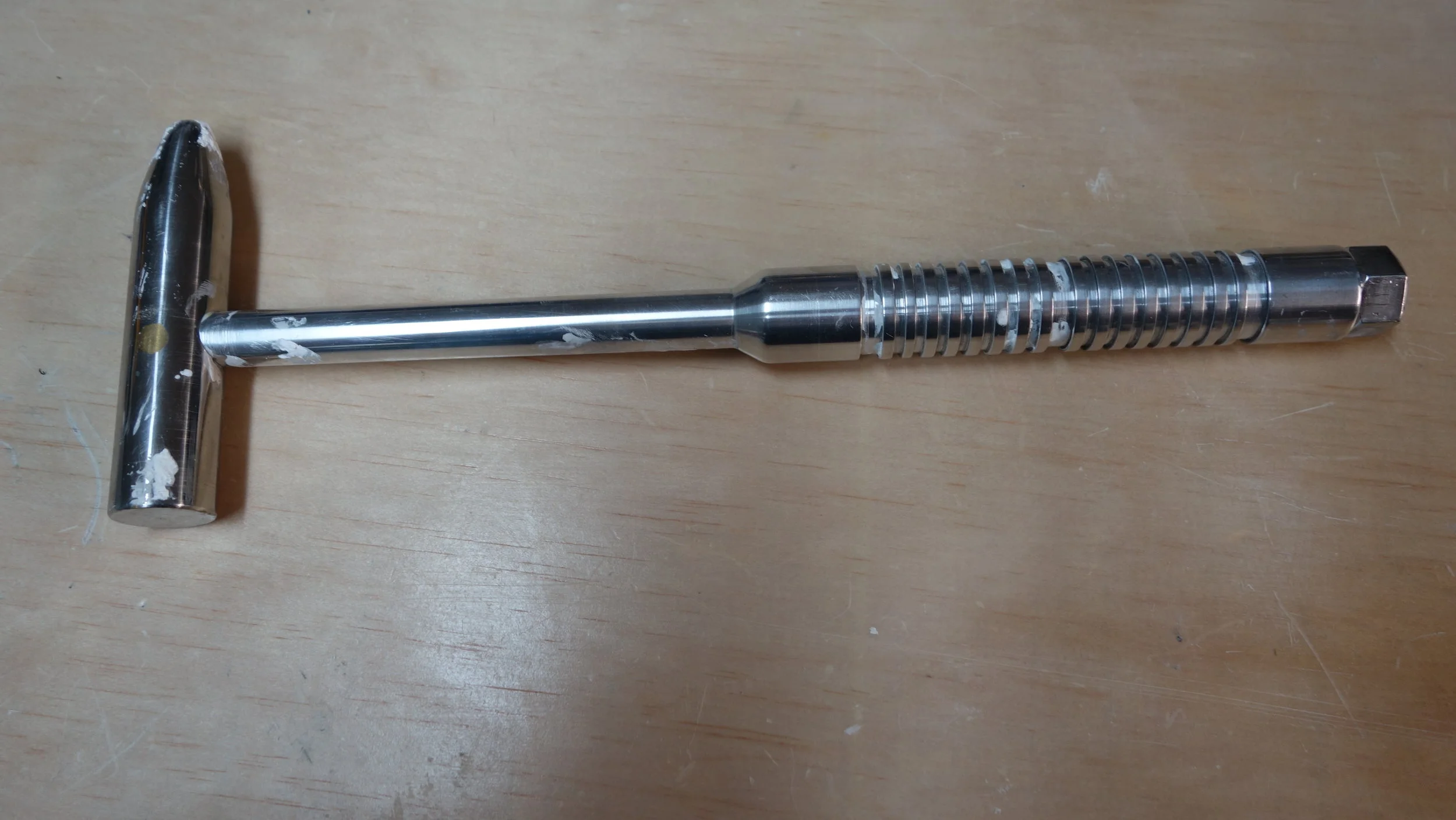 The head is composed of a single piece of 304 stainless steel (the hardest, toughest material readily available on campus) while the hammer handle I turned from the same piece of 2025 aluminum that I used for my first machinist's hammer. One of the big lessons from that project was that a screw-on head is not the way to go. People like to see if they can unscrew the two pieces, and I have a feeling that the threads are getting very slightly beat up from the pounding. Given the amount of use that hammer has been getting, that's fine for a prototype machinist's hammer, but less fine for something intended for rougher use. I had originally planned to press-fit the handle to the head using LN2, but after a bit of experimenting it seems like an aluminum-steel press fit isn't likely to hold up (at least given my current skill set), so I ended up using a brass pin to hold the head to the handle, and then peaning it into place.