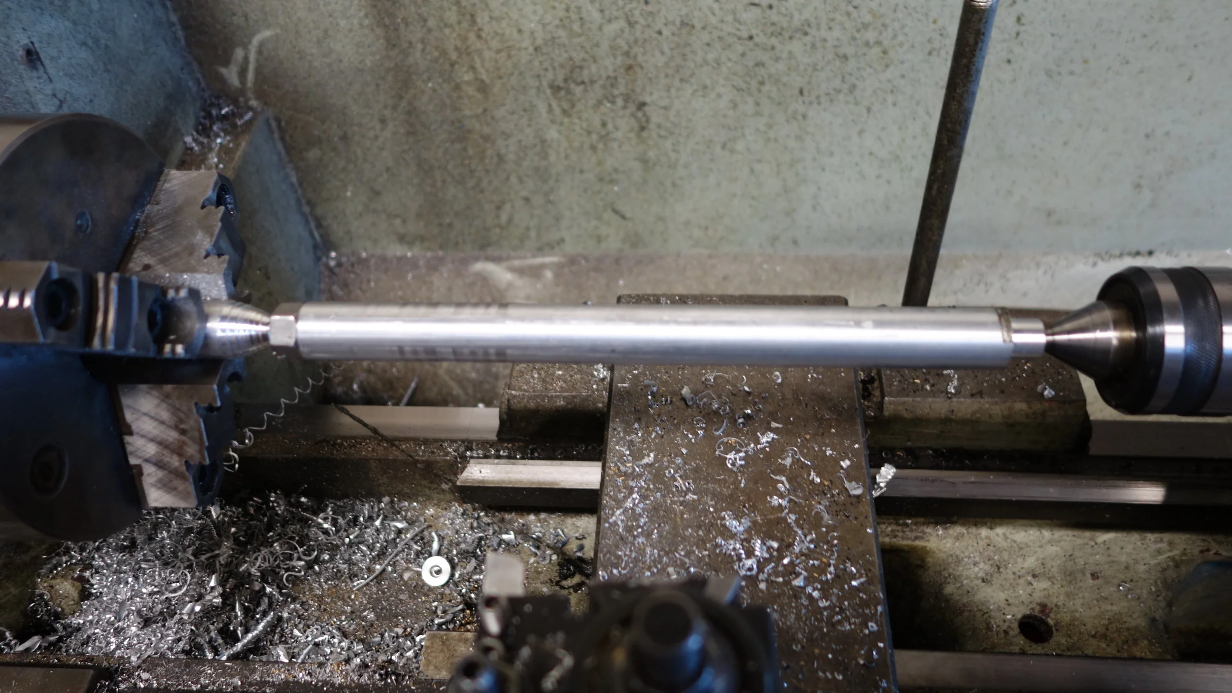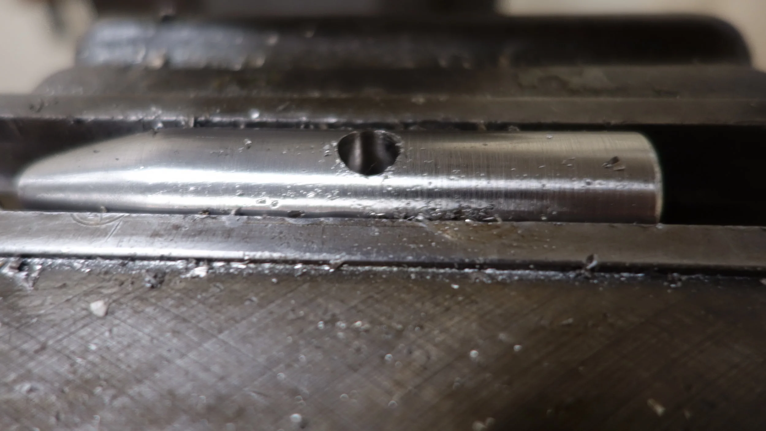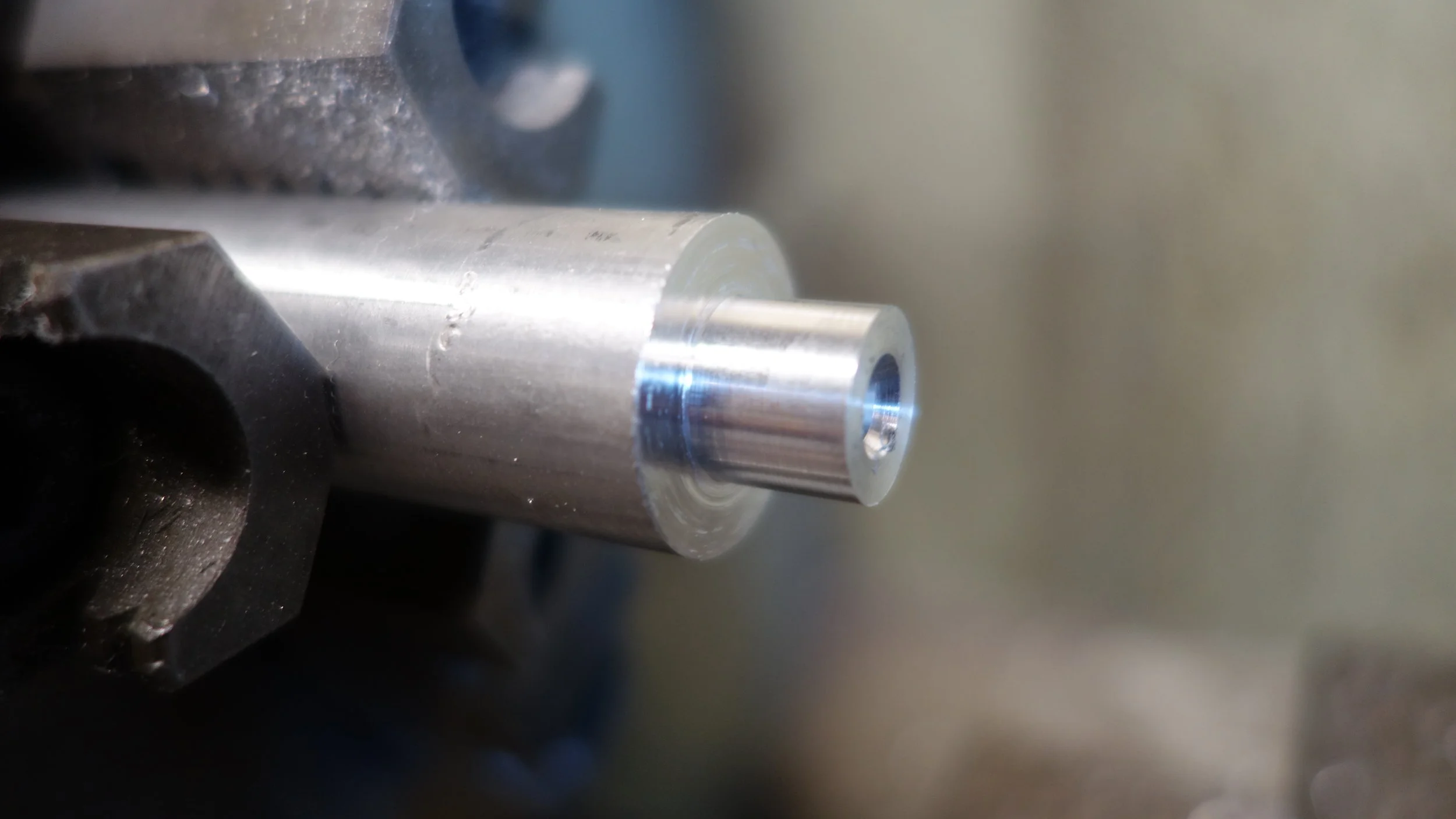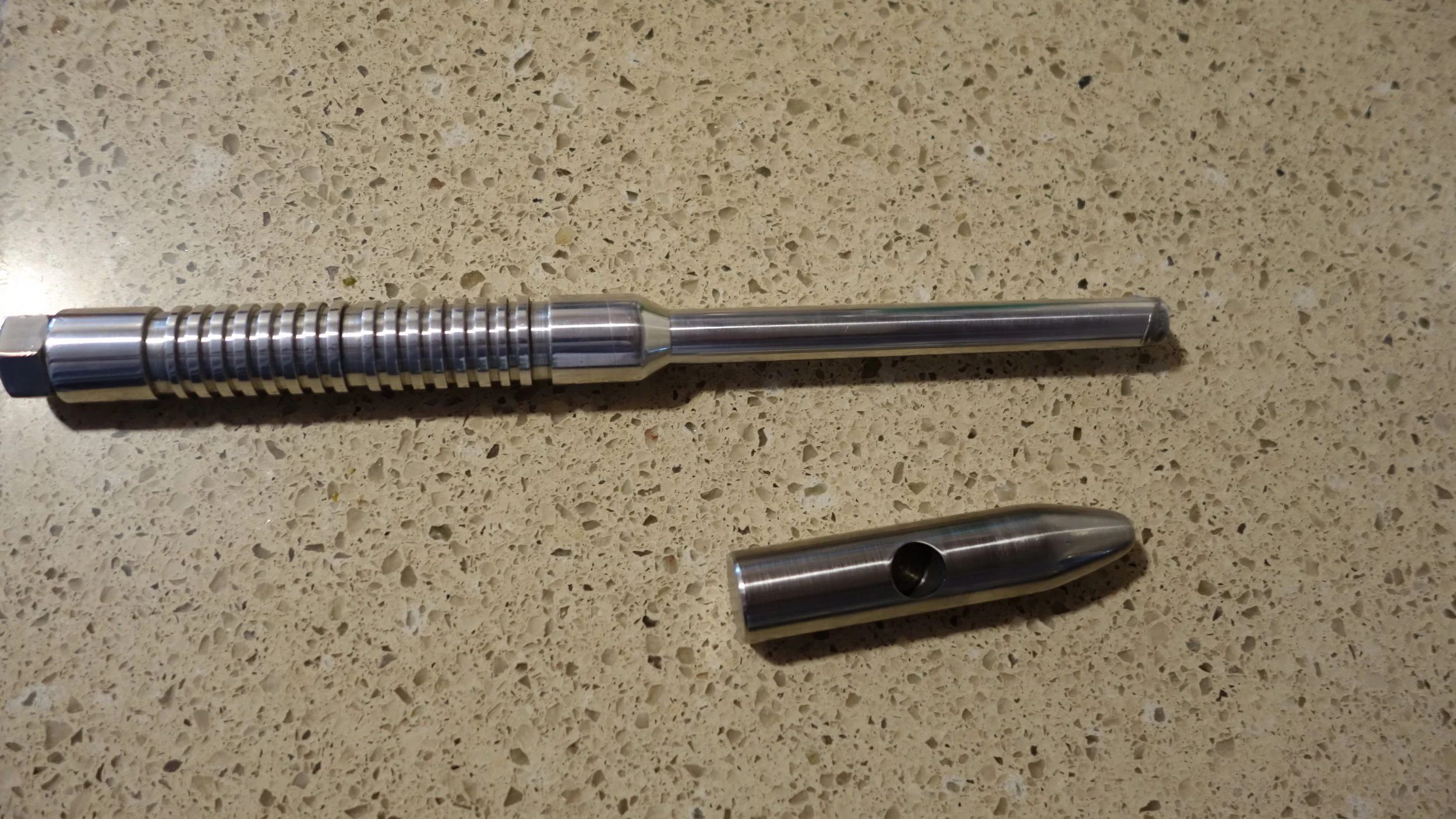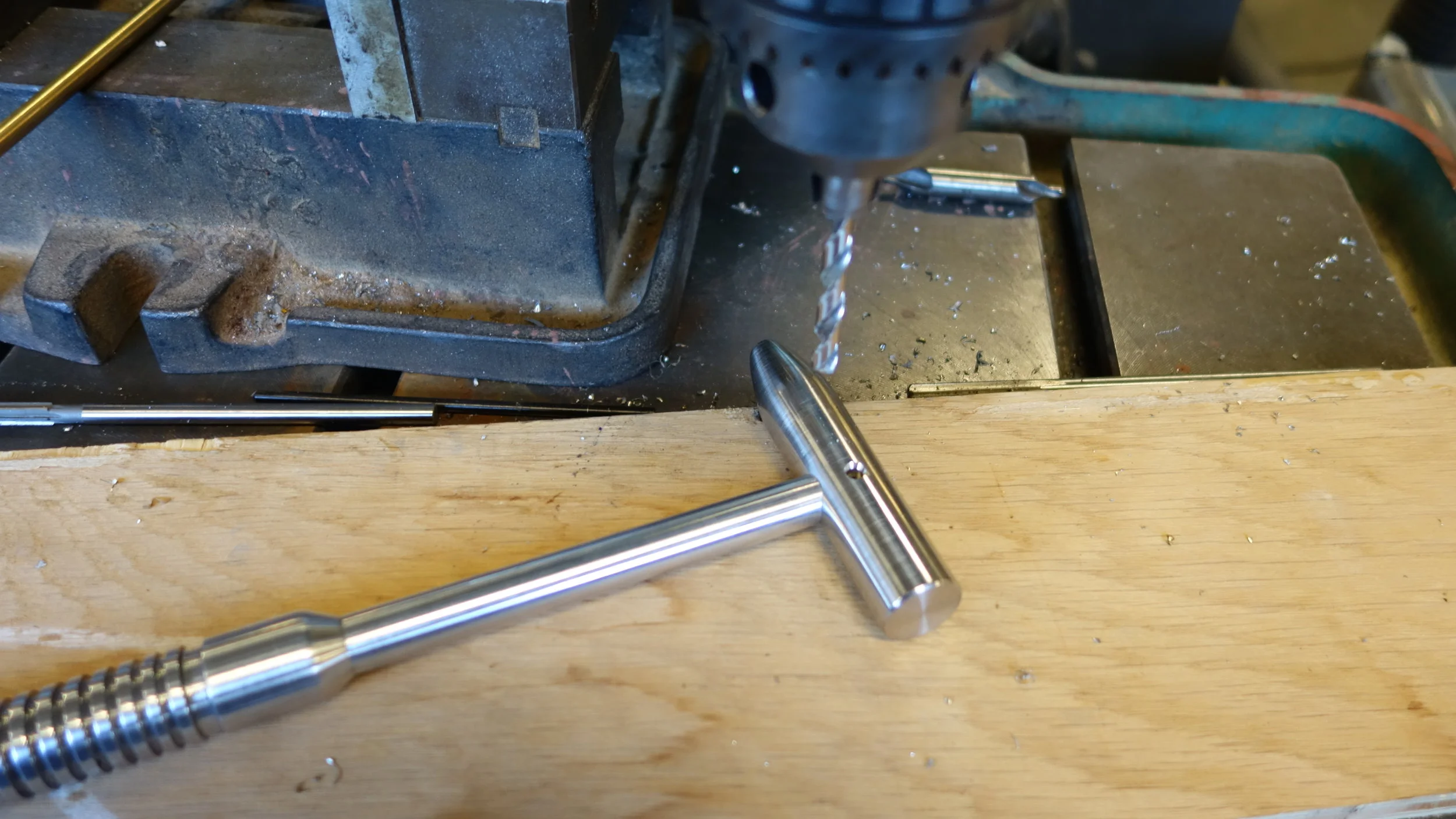 The head is composed of a single piece of 304 stainless steel (the hardest, toughest material readily available on campus) while the hammer handle I turned from the same piece of 2025 aluminum that I used for my first machinist's hammer. One of the big lessons from that project was that a screw-on head is not the way to go. People like to see if they can unscrew the two pieces, and I have a feeling that the threads are getting very slightly beat up from the pounding. Given the amount of use that hammer has been getting, that's fine for a prototype machinist's hammer, but less fine for something intended for rougher use. I had originally planned to press-fit the handle to the head using LN2, but after a bit of experimenting it seems like an aluminum-steel press fit isn't likely to hold up (at least given my current skill set), so I ended up using a brass pin to hold the head to the handle, and then peaning it into place.