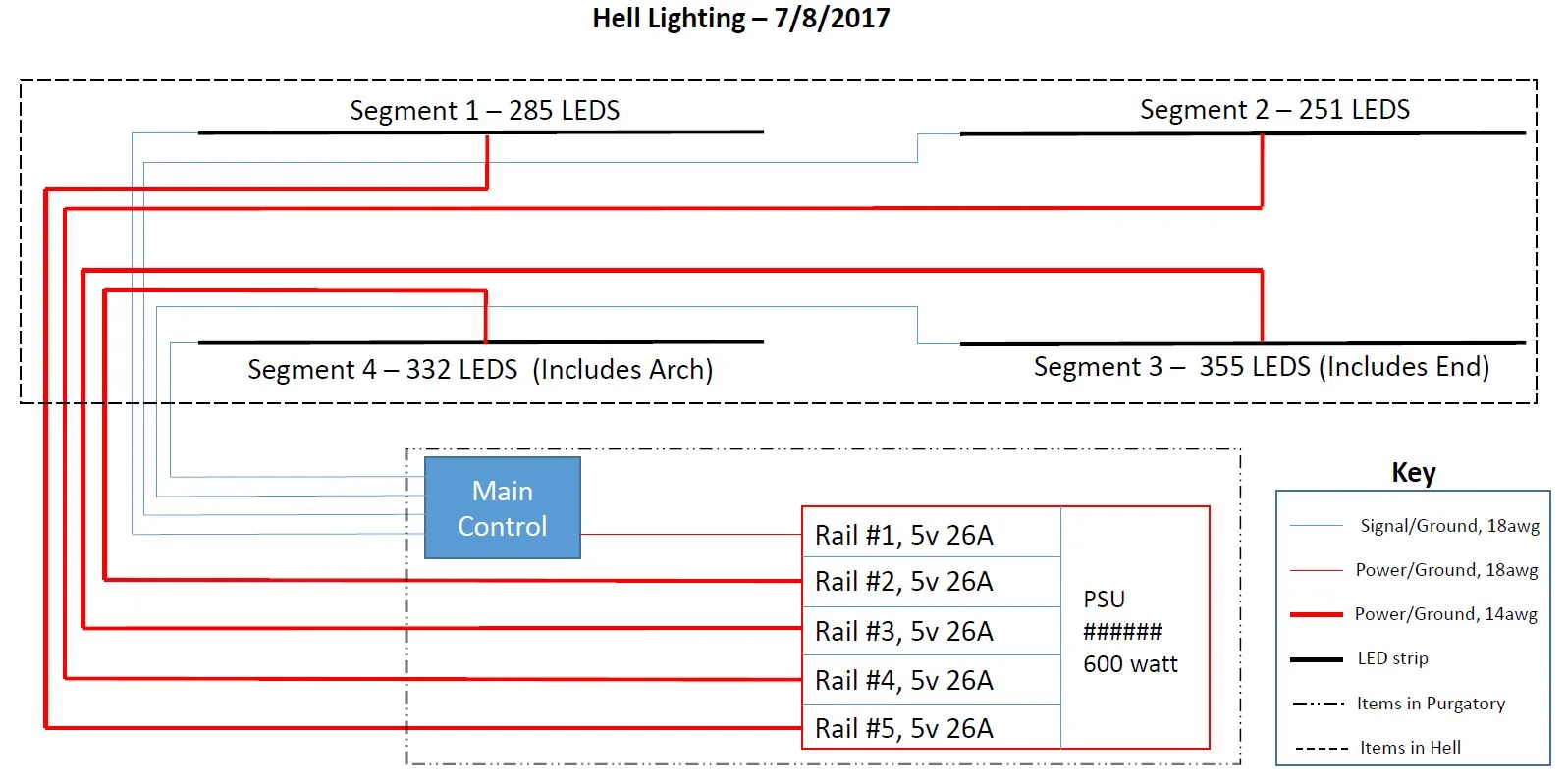 Hell lighting V2 is composed of four sections, each containing approximately 300 LEDs. Each section is powered by a single 5V 26A rail of the main Cosel ACE650F modular power supply. The control unit runs off the final 5v rail of the power supply, though it can be moved to one of the main lighting rails if we make the decision to add a 5th lighting section in purgatory. Power for the four LED sections runs through 14 gauge UL 1316/1452 THHN black copper wire in twisted pairs. While the control unit is powered off of similarly rated 18 gauge black wire wire. Power for each section is provided at a single point in the center of that section. We have found this to be sufficient, in practice, to prevent visible color aberration under normal use. Additionally, each power supply rail has been seperately adjusted to ensure a steady 5v at the point of use.