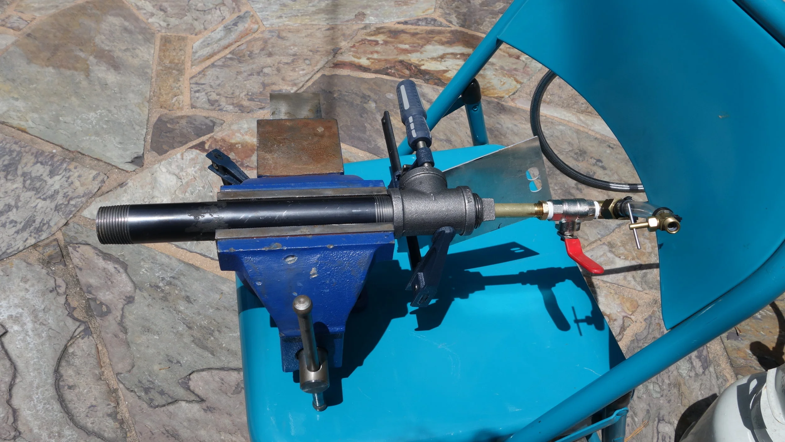 Finally, screw the steel end-cap into one side of the T-Section and the steel pipe into the other side. The torch is now ready to be connected to propane for testing.