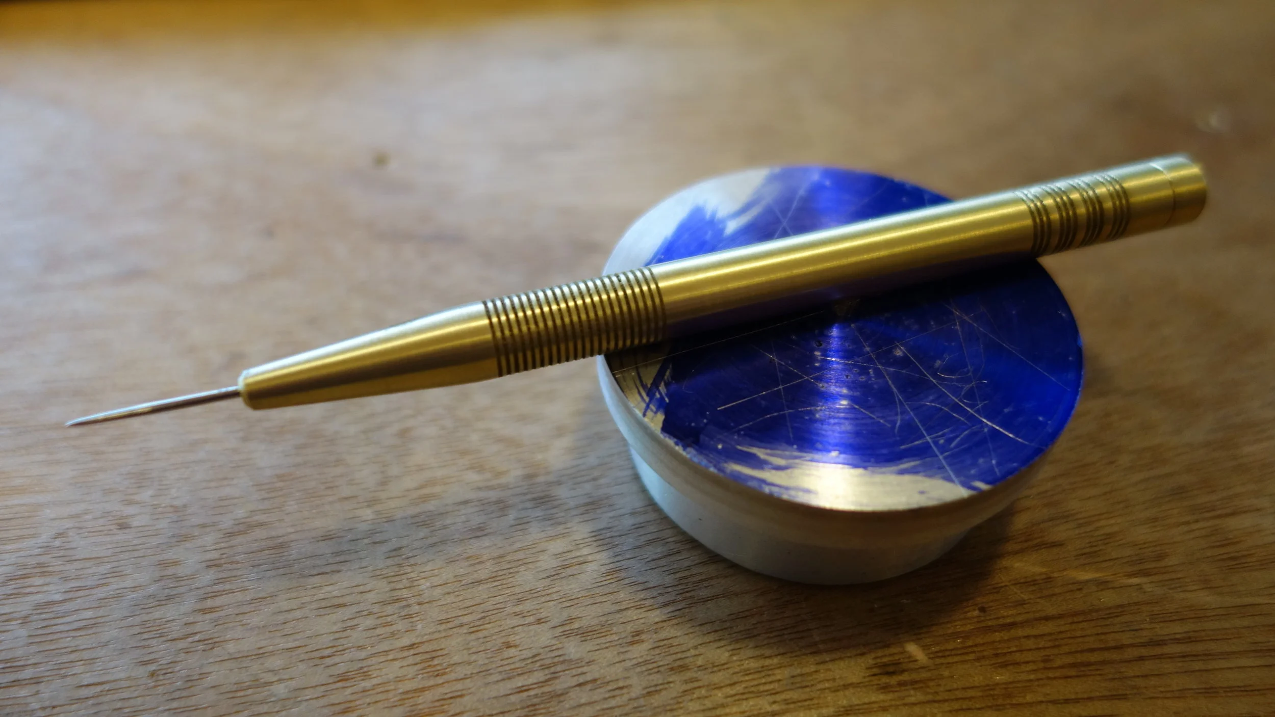 A simple metal scriber made out of brass with a replaceable sewing needle for a point. I based this project off of the Clickspring metal scriber project (linked in post) and it was a great way to get familiar with the eccentricities of a bench top lathe. Plus, when a project's last step involves polishing brass with fine grit sandpaper there really aren't too many ways to avoid a nice end product.