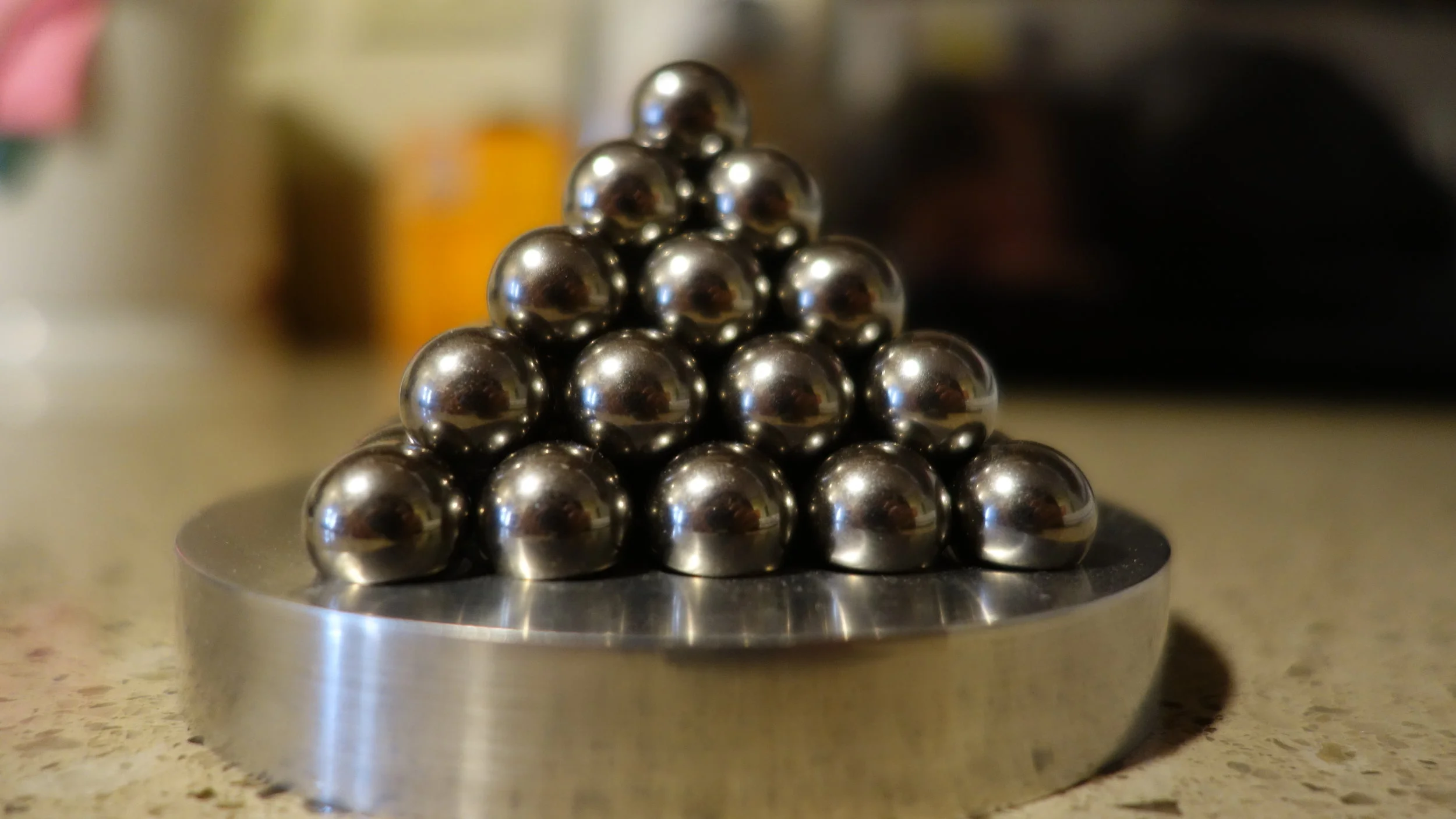 This was actually my second successful machining project. It's a flat (turned) disk with semi-circular holes milled in the top to capture the lowest layer of the bearing pyramid. This was a very "educational" (read: error filled) project, and I would deffinitly recomend it if you are looking to get more comfortable using mill handwheels with no DRO.
